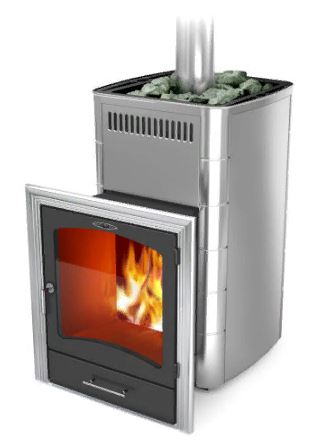 Печь банная камин Калина Inox с большим светопрозрачным экраном, с теплообменником, нержавеющий конвектор, передняя рамка нержавеющая
