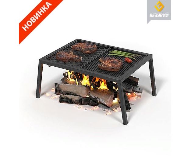 Подставка сделана из квадратного металлического профиля, покрыта термостойкой краской. Она рассчитана на размещение двух плит или решёток Везувий (Гриль, Стейк, Морепродукты или Бургер). Краска требует термозакалки. Поэтому перед первым использованием подставки необходимо прогреть её до исчезновения запаха и дыма. После закалки краска становится прочнее и лучше защищает подставку от внешних повреждений.