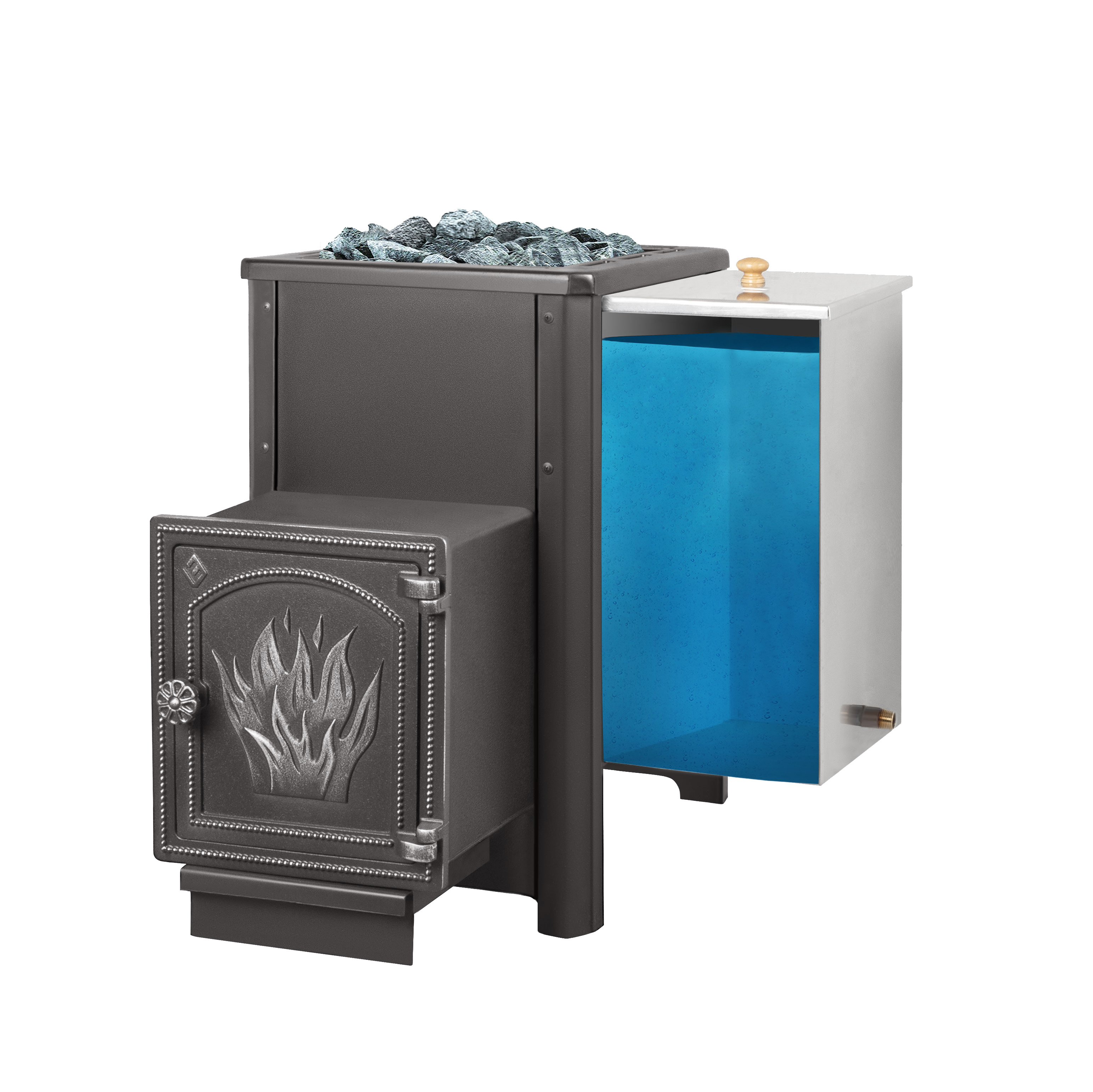 7. В комплекте идёт навесной бак для воды (49 литров) который устанавливается с правой или левой стороны печи.