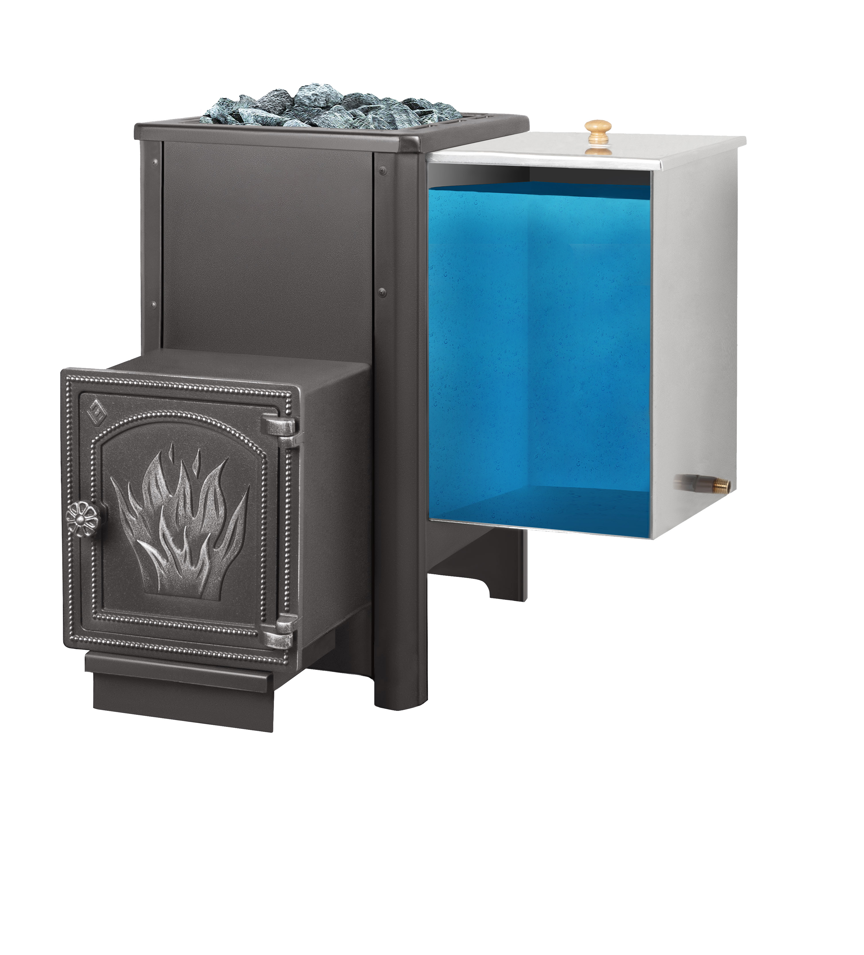 7. В комплекте идёт навесной бак для воды (61 литров) который устанавливается с правой или левой стороны печи.