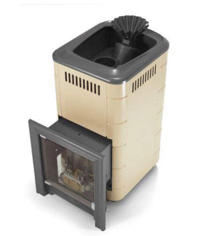 Модификация печи «Таймыр 2017 Inox» с закрытой каменкой и большим светопрозрачным экраном, конвектор бежевого цвета.
