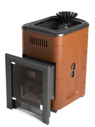 Модификация печи «Таймыр Мини 2017», имеющая встроенный теплообменник для нагрева воды в выносном баке, закрытую каменку и большой светопрозрачный экран. Конвектор цвета «терракота»